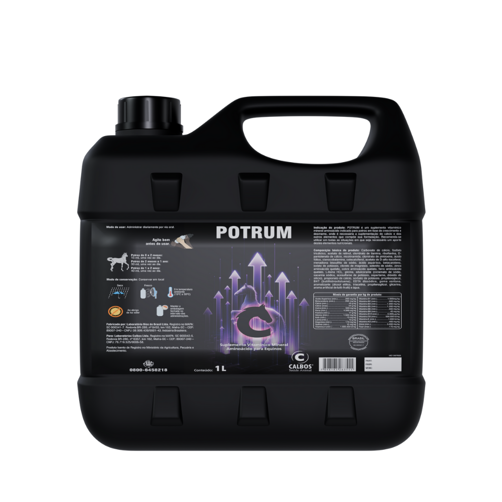 Potrum L é um suplemento vitamínico mineral indicado para potros em fase de crescimento e desmame, onde é necessária a suplementação do Cálcio e dos outros elementos que compõe sua formulação. Recomenda-se utilizar em todas as situações em que seja necessário um aporte destes elementos nutricionais.